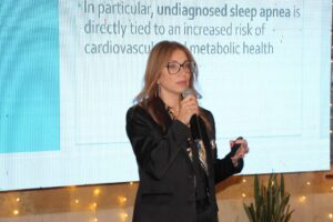 وتحدثت أخصائية أمراض الرئة والنوم الدكتورة جوسلين ساسين، حول أهمية رفع الوعي لمخاطر انقطاع النفس أثناء النوم واستراتيجيات الوقاية والعلاج المبتكرة وجديدها جهاز انقطاع النفس أثناء النوم الذي تقدمه ” SoulMed ” الذي يتميز بحجمه الصغير ووزنه الخفيف، مما يوفر راحة أكبر للمريض أثناء استخدامه. معتبرة أن هذا التصميم المبتكر يساعد المريض على النوم بشكل أفضل ودون أي إزعاج، مما يضمن جمع بيانات دقيقة وشاملة تُسهِّل على الأطباء الوصول إلى تشخيص أكثر وضوحًا ودقة، مما يعزز من فعالية العلاج وتحسين صحة المرضى.