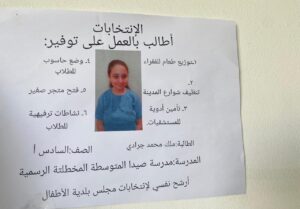 وعشية إنتخابات المجلس البلدي للأطفال ، نشطت ” الماكينات ” الإنتخابية للمرشحين الصغار في حملاتها الإنتخابية عبر رفع صور المرشحين وشعاراتهم وعناوين برامجهم الإنتخابية في قاعات الصفوف والممرات والملاعب، داخل المدارس المشاركة وهي :